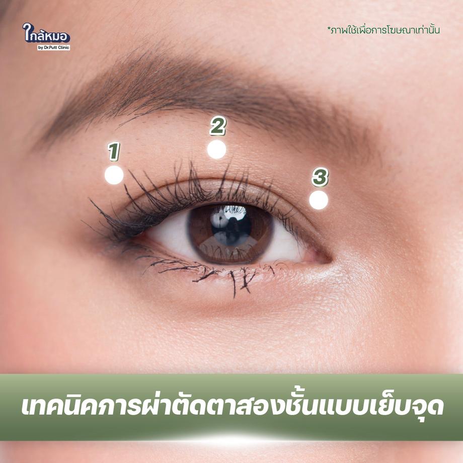 เป็นการทำตาสองชั้นโดยไม่ต้องกรีด จะใช้วิธีเย็บชั้นที่เปลือกตาโดยแพทย์จะเย็บไหมที่เปลือกตา ประมาณ 2-3 จุด เพื่อสร้างรอยพับของหนังตาให้เป็นสองชั้น จะทำให้ดูเรียบเนียน ไม่เห็นแผล เหมาะสำหรับคนที่ตาชั้นเดียว หนังตาและไขมันไม่หนา ไม่หย่อนคล้อย
